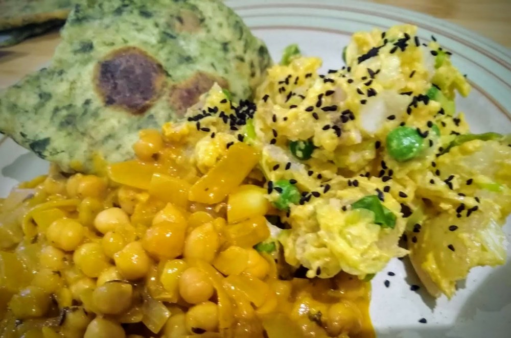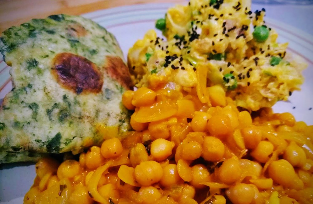 Chickpea dhal, coconut and spinach flat-bread and curried crushed new potatoes