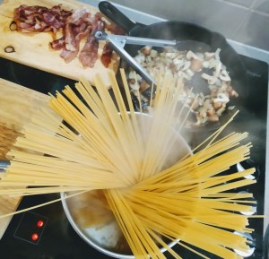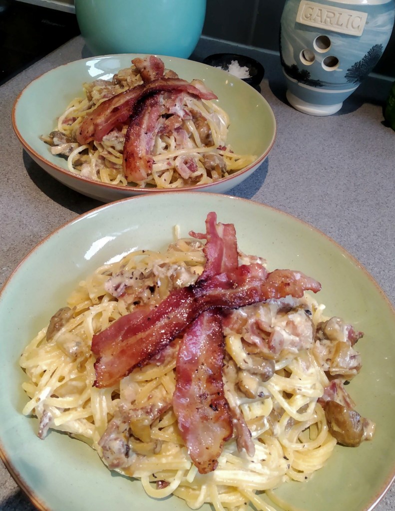 It’s a regular favourite in our house. With smokey, sweet crisp bacon, tender mushrooms and a rich creamy cheesy sauce there is nothing not to love. Call it carbonara in front of an Italian and you will likely be firmly corrected. It’s not a carbonara but it met one once.