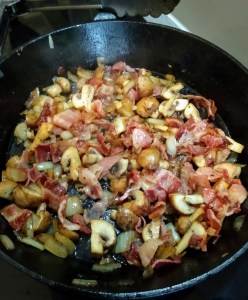 In a large heavy based frying pan cook the bacon over a medium heat until the fat is starting to crisp and turn golden but the flesh is still chewy. Once the bacon is cooked set it aside and add the onions to the pan of bacon fat. Stir occasionally.