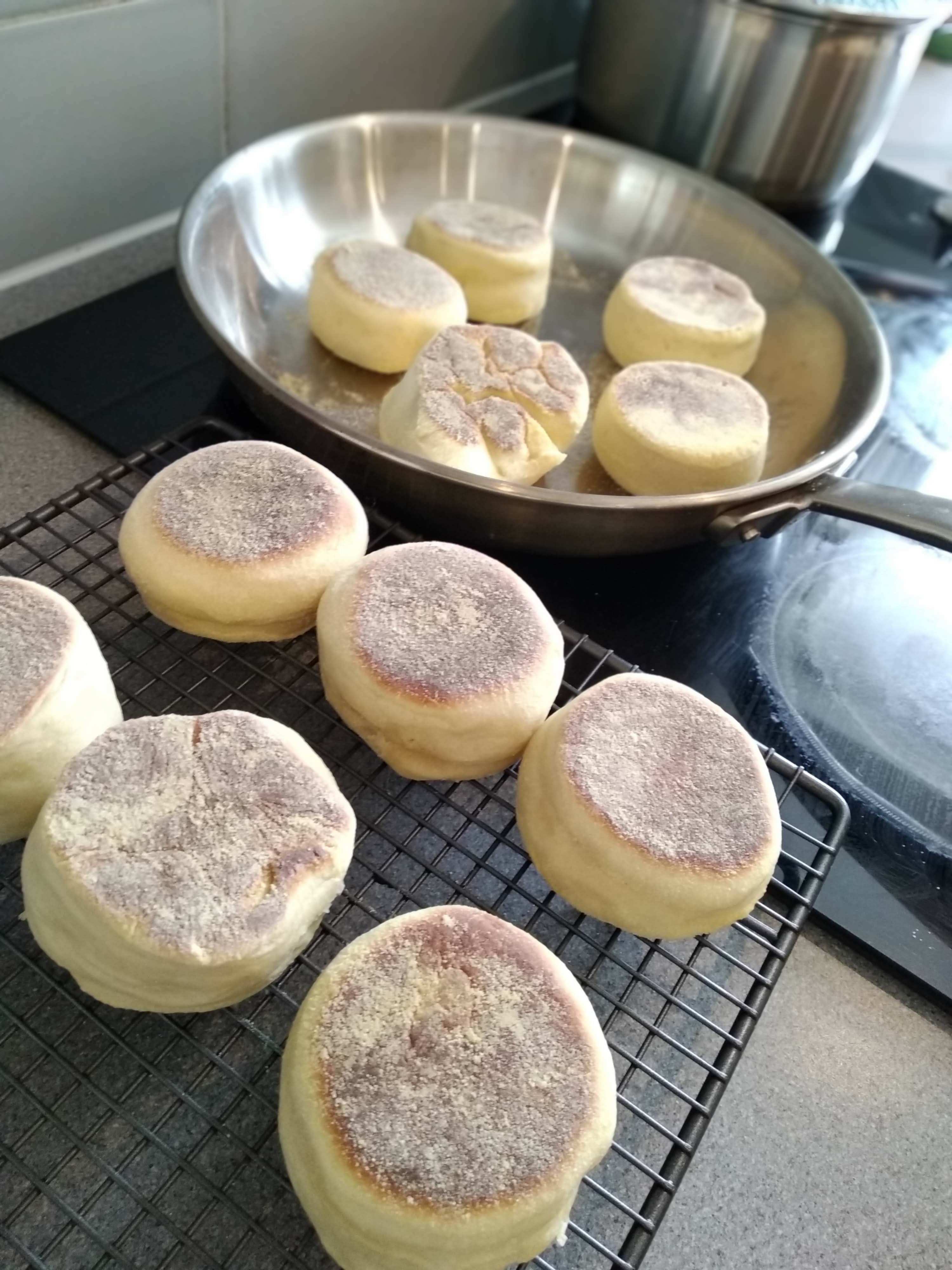 Preheat a large weighty frying pan on the hob on a very low heat. Dry fry the muffins for approximately 5-7 minutes, then flip over and cook for another 5-6 minutes on the other side. Move them to cool on a rack.