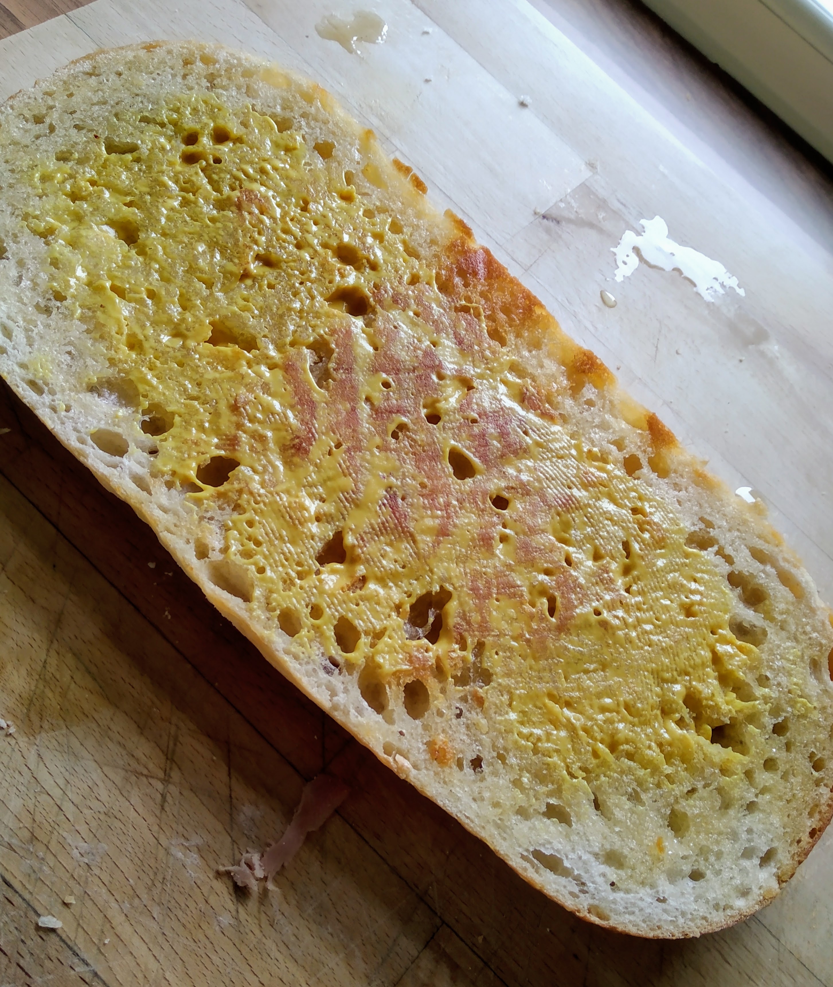 Time to slice the meat and start assembling your sandwich.Spread the american mustard on the toasted bread.