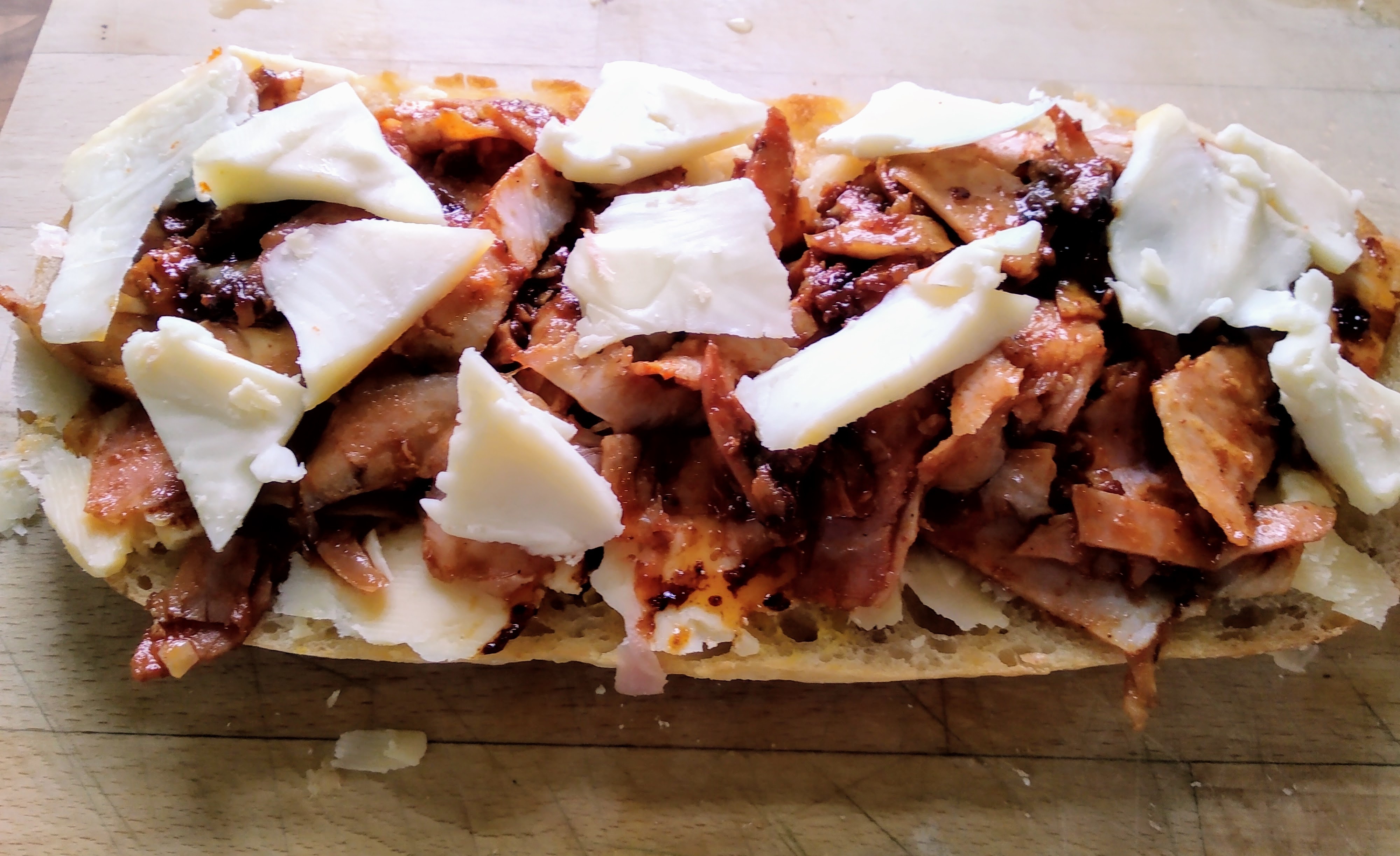 Now layer on the sliced pork. If you really want to intensify the flavour toss the sliced meat in the juices/marinade left in the roasting tin. Top the sliced meat with torn/sliced/crumbled/grated cheese and then the next slice of toasted bread.