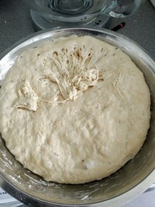 The next day, at least one hour (two is better) before you want to use the dough, bring it out of the fridge. It should have risen and be sticky and wobbly and smell a little boozey.