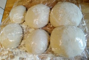 Handling the dough with a light touch tuck the corners under each lump and tidy them into neat balls. Roll each ball in flour and cover with a sheet of cling film to stop them drying out.Light a fire in your pizza oven or turn your oven up to maximum and pop a pizza stone in now.