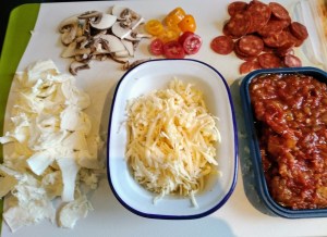 Pizza sauce, – recipe to follow soon. Basically lots of garlic some oil onion and pasatta.